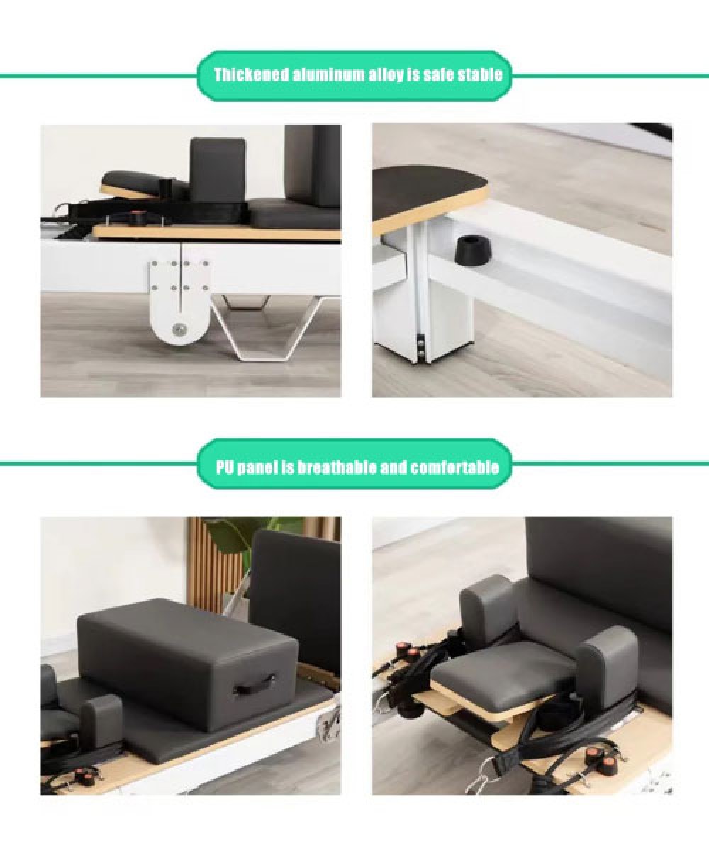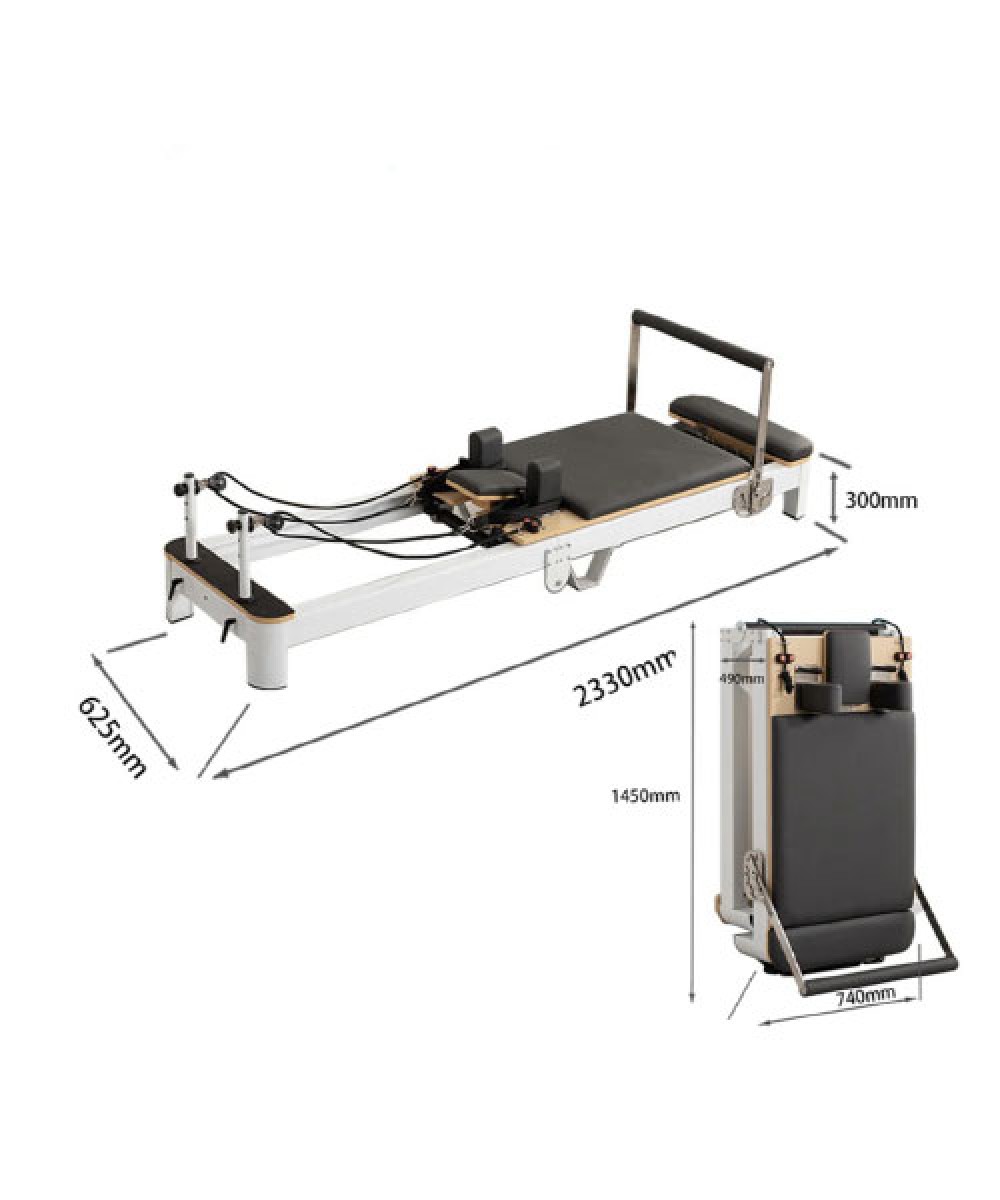 تخت پیلاتس ریفورمر مدل آلمینیومی و تاشو برند A S با کیفیت ساخت عالی و از جنس فولاد با آلیاژ آلومینیوم می باشد.