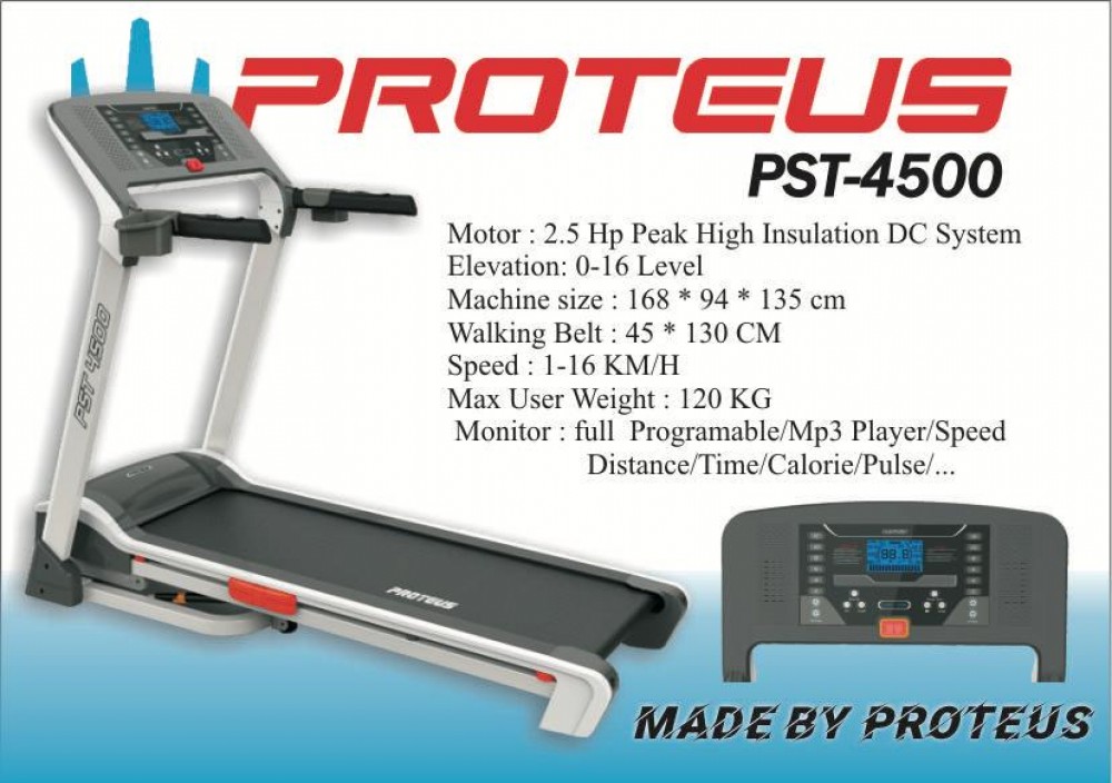 دستگاه تردمیل پروتئوس مدل PST-4500 یکی از انواع تردمیل خانگی است که با قدرت موتور 2.5 اسب بخار و با نوع DC وارد بازار شد.